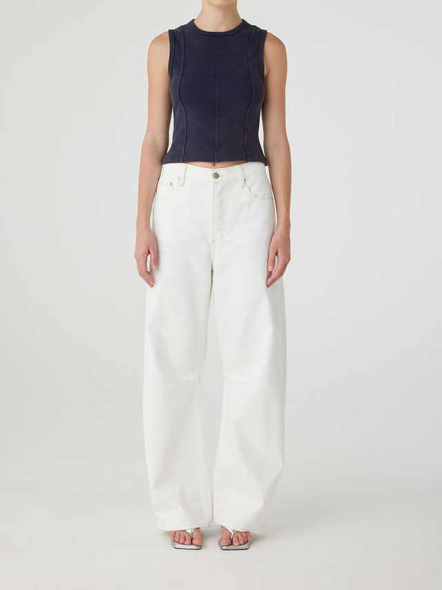 The bow-legged jean. The Vera Jean sits just below the navel, is relaxed through the hip and leg, with a bow leg profile and finishes at the top of the shoe. Features a knee dart and button fly. Crafted from premium rigid denim.