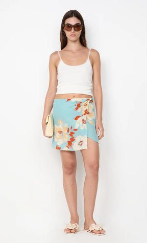 Calliope Mini Skirt in Sonara. This floral wrap mini skirt features a bead detail at the waist and a hip cutout, perfect for day-to-night styling.