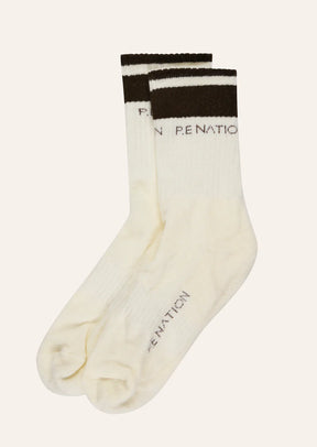 The Homage Sock in Whisper White & Tarmac comes as part of our FUTURE MODERN Collection. A cotton blend rib crew sock with P.E branding and stripe detail.