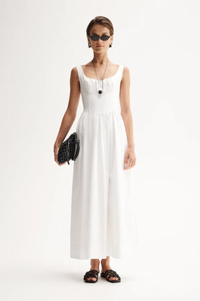 Made of a lightweight, breathable cotton, the Sonia Dress offers a delicate, feminine option for summer eventing. This dress is cut to a maxi length with a fitted silhouette and features a corset-style waist, gathered bust detailing, and full skirt.