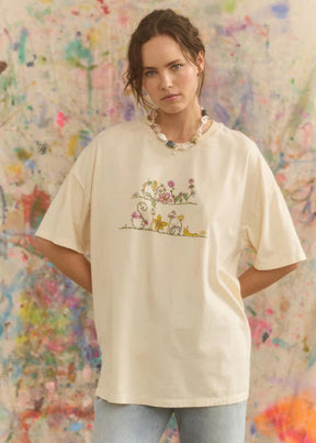 The Grow Slow OG Tee features a hand-drawn garden motif where mushrooms, wildflowers, vines and tiny critters spell out Grow Slow in whimsical illustrated lettering.