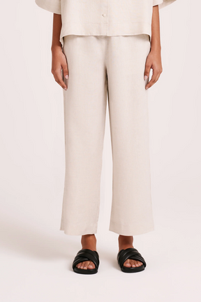 The Lounge Linen Crop Pant is made in a premium 100% organic French linen which has been washed down for a soft and breathable handfeel. The silhouette is a clean, casual fit with a wide leg opening finishing at ankle length. Features include an elasticated waistband with a mock button front, side seam pockets and back patch pockets with Nude Lucy branded label. Pair with a Nude Lounge top in coordinating colours.