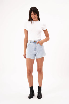 A fresh summery update of the Mirage short. Built with a form-fitting high waist that effortlessly falls to a wide-leg profile. Nina Blue Organic is a soft light blue, rigid denim that is made to shape to your figure while retaining shape. Keeping things relaxed, we have kept the hem raw for an edgy update