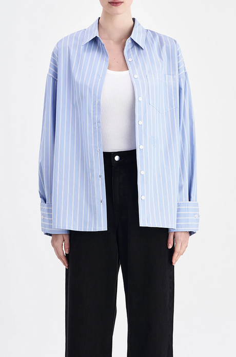 Blue and White Striped Cotton Shirt with Ruffle Detail | Kings Blue