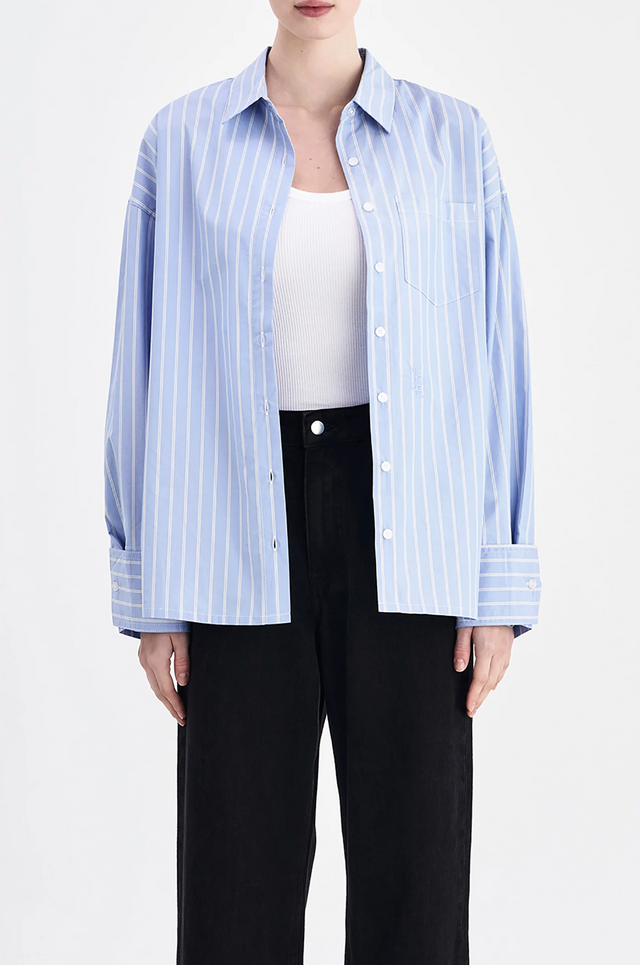 Organic poplin Oversized silhouette Front patch pockets Large cuff Nude Lucy branded buttons Nude embroidery detail The Organic Poplin Shirt is made from a organic cotton poplin which has be washed for a smooth, crisp hand feel. The silhouette is oversized throughout with length finishing on the hips. Features include front patch pockets, a large cuff and Nude Lucy branded buttons.