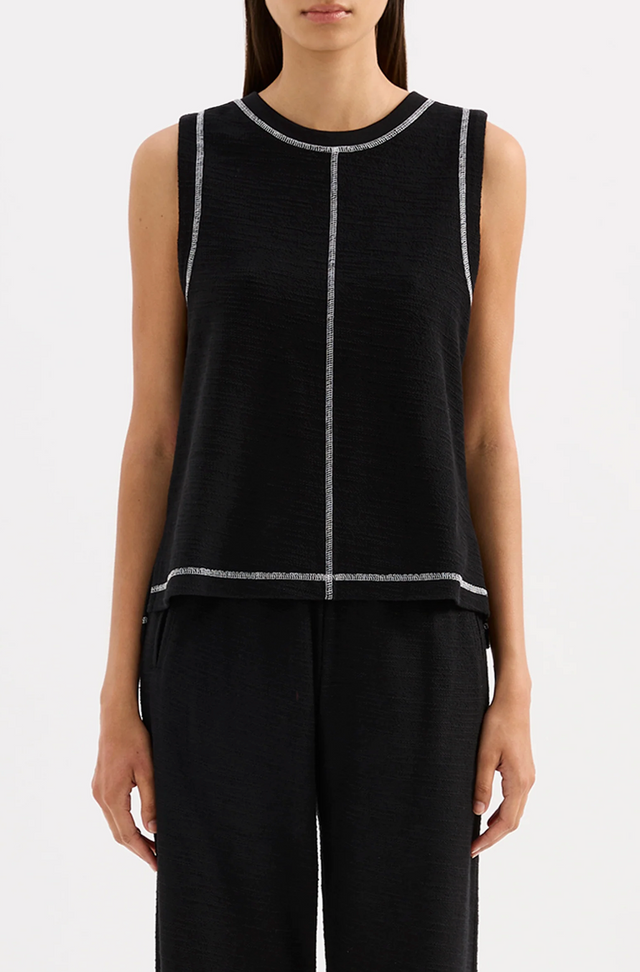 The Sutton Tank is made from a textured cotton fabrication that is soft on the skin. The silhouette is a boxy fit tank finishing at the hip. Features include a crew neckline, stepped hem with side slits and contrast stitching detail.
