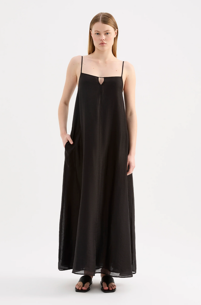 The Axel Maxi Dress is made from a light weight lyocell blend fabric which is slightly sheer and has a smooth hand feel. The silhouette is relaxed with a billowing skirt finishing at ankle length. Features include side seam pockets, adjustable straps, back tie and triangle cut out at centre front neckline. This dress is fully lined.