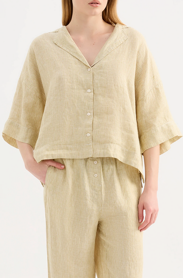 The Lounge Stripe Linen Shirt is made in a premium 100% organic French linen which has been washed down for a soft and breathable hand feel and features an exclusive yarn dyed stripe. The silhouette is a classic shape, with a clean and casual fit. Features include a wide collared neckline, button front opening and wide elbow length sleeves. This shirt also includes the Nude Lucy branded label. Pair with a Nude Lounge Bottom in coordinating colours.
